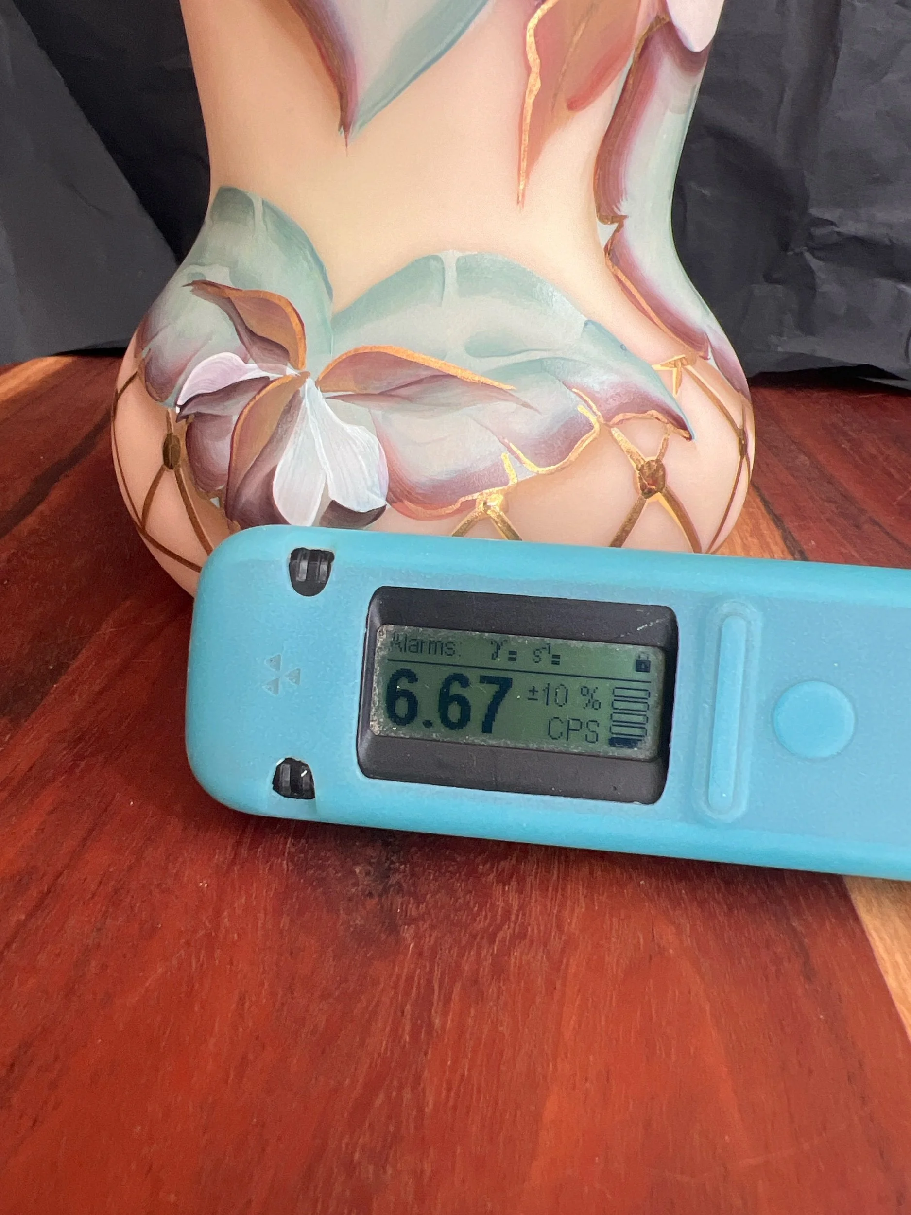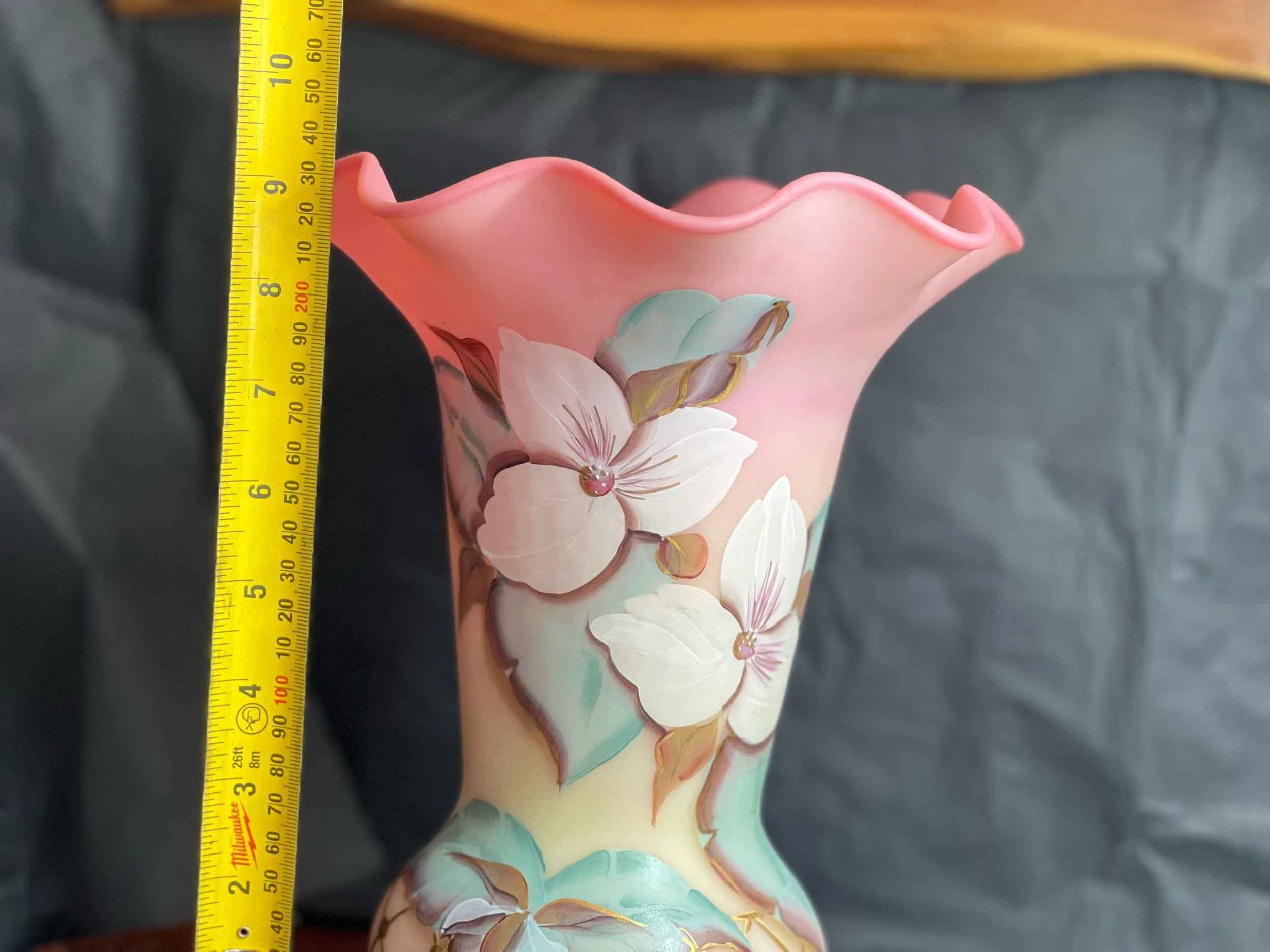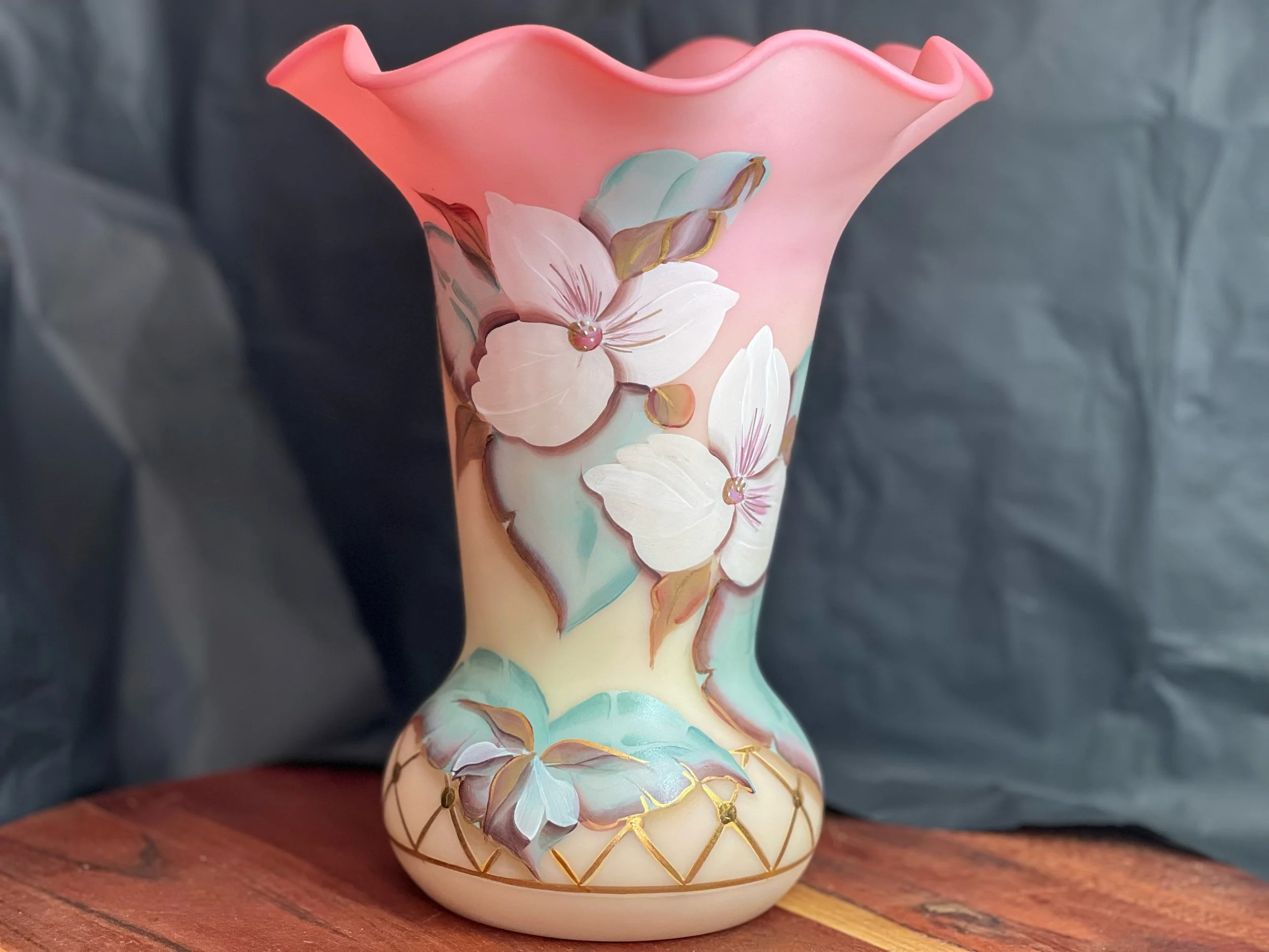 The vase features a ruffled rim and a hand-painted design of white trillium flowers with green leaves and 22k gold accents.