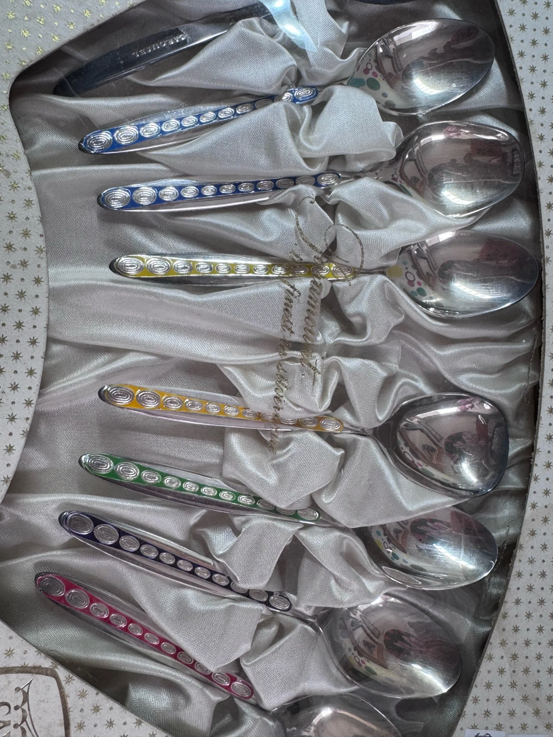 $10 Flat rate shipping with in Australia or free pick up from our store. › New vintage coloured spoons carousel party pieces rainbow Image 1 of 3 Image 2 of 3 Image 3 of 3 New vintage coloured spoons carousel party pieces rainbow $60.00 New boxed spoonsColoured enamel handles Very funky for your vintage kitchen Box slightly damaged Brand Luke Add To Cart Added! New boxed spoonsColoured enamel handles Very funky for your vintage kitchen Box slightly damaged Brand Luke