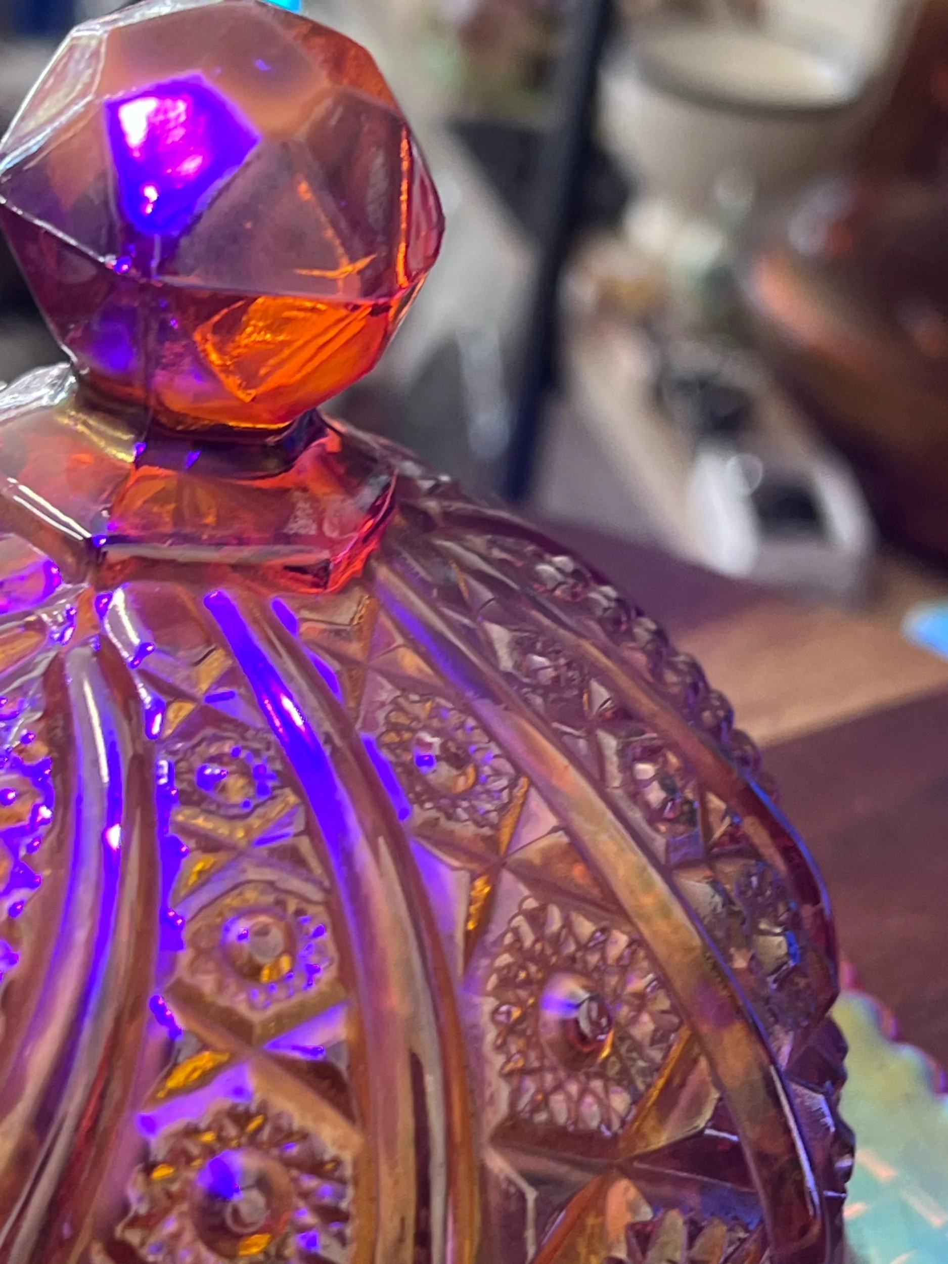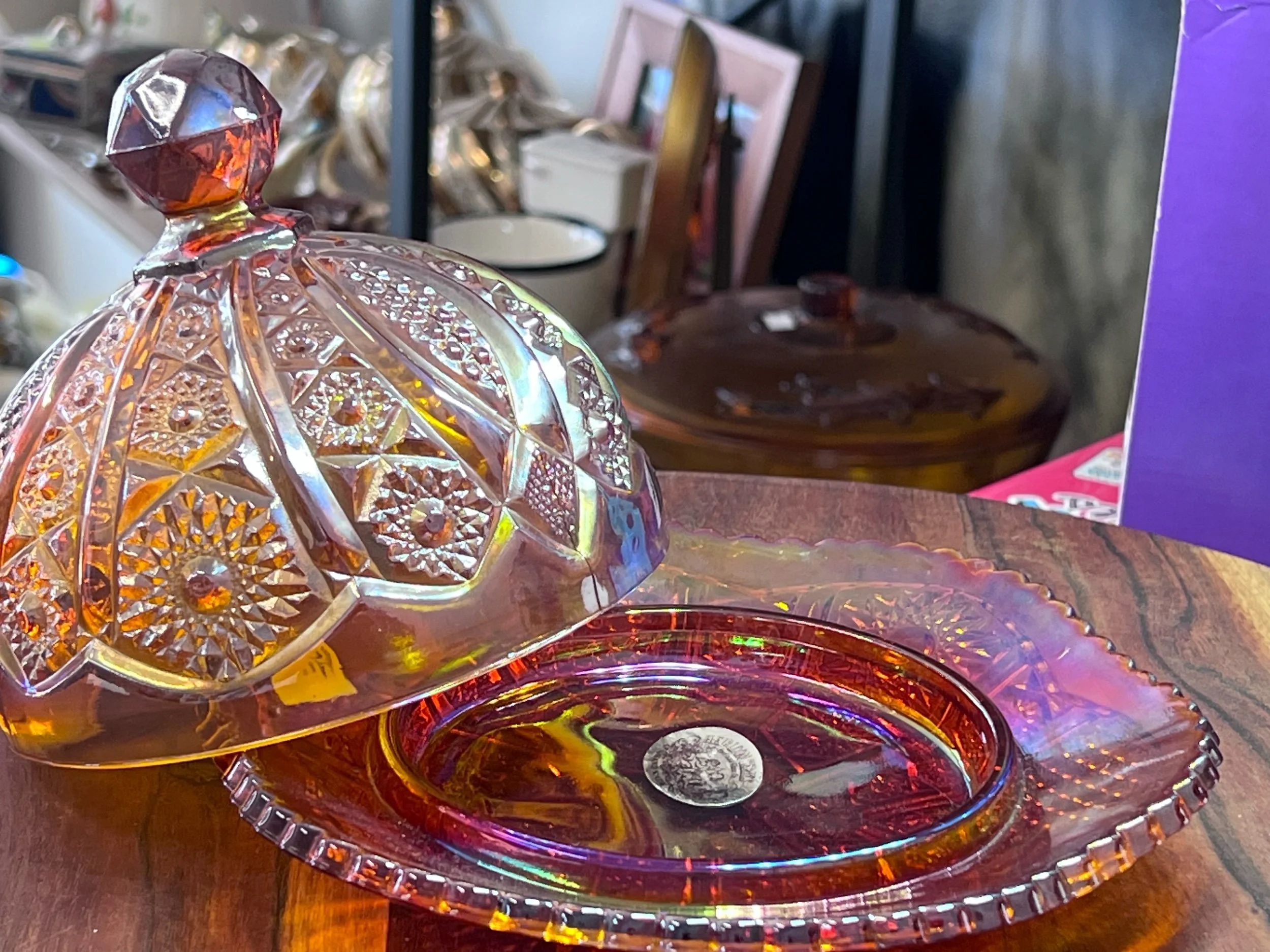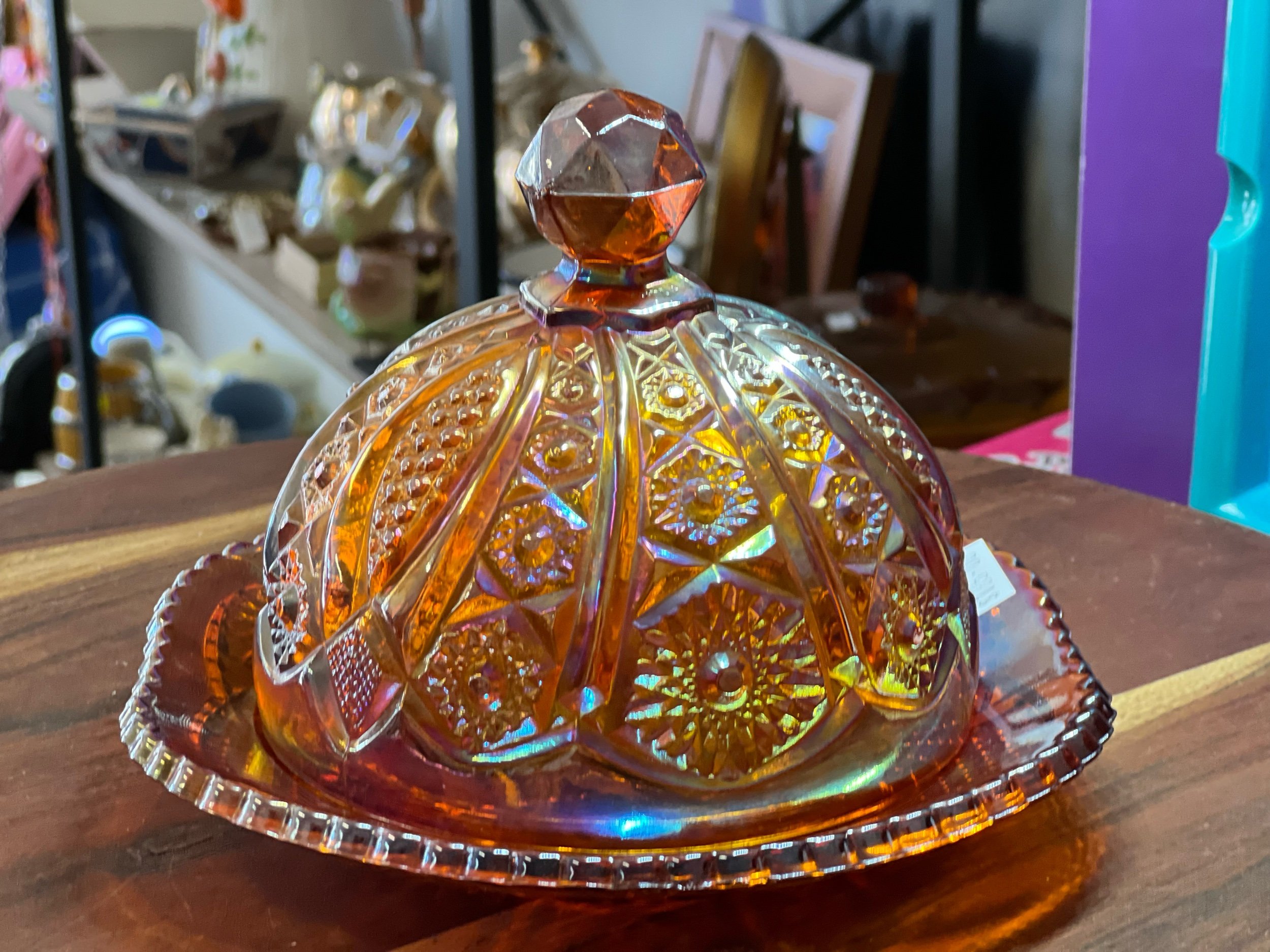 $10 Flat rate shipping with in Australia or free pick up from our store. › Heirloom Indiana glass butter dish Image 1 of 8 Image 2 of 8 Image 3 of 8 Image 4 of 8 Image 5 of 8 Image 6 of 8 Image 7 of 8 Image 8 of 8 Heirloom Indiana glass butter dish $185.00 Vintage sunset red with cadmium carnival glass #123 panelled daisy fine cut Add To Cart Added! Vintage sunset red with cadmium carnival glass #123 panelled daisy fine cut